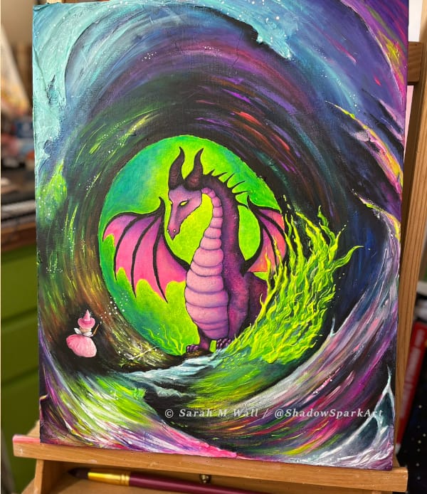– This painting is sold and with it’s new owner, but you’ll find updates on available paintings via my @ShadowSparkArt Instagram account, where I post about works in progress.