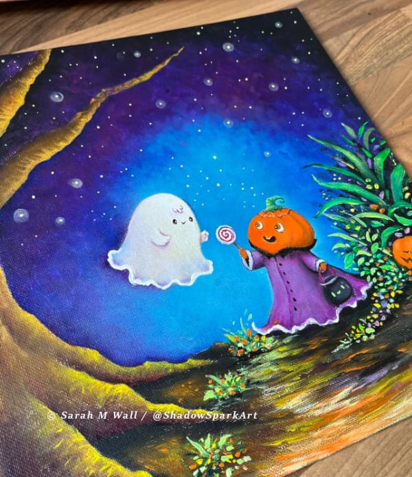 **SOLD** – Original Halloween painting depicting a cute pumpkin character trick ‘r’ treating with his little ghost buddy. This artwork was inspired by my fascination with Halloween / Samhain and is painted in acrylics on canvas board in my little messy studio on the east coast of Ireland.